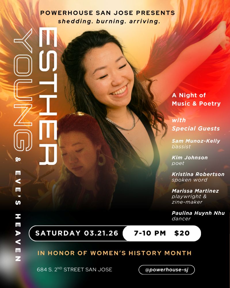 Writer/Musician Esther Young → PowerHouse will host an important evening of poetry and music, headlined by writer and musician Esther Young. Her set will include songs from her 2022 EP Small Hands, Heavy Heart, and she will be joined by three poets (Kristina Robertson, Marissa Martinez, Kim Johnson) and interpretive dancer Paulina Huynh Nhu. March 21 at PowerHouse, San Jose.